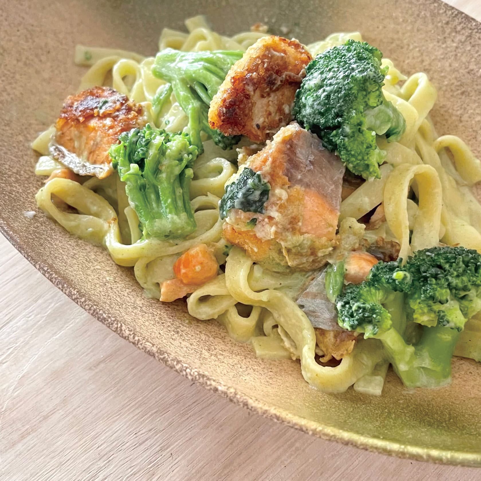 生パスタ、ブロッコリー、ほうれん草を入れて混ぜ合わせる